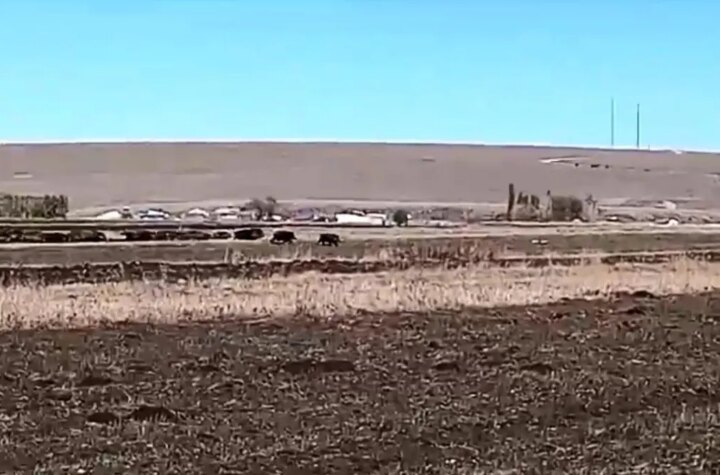 Kars'ın Akyaka ilçesindeki Karahan köyünde mısır tarlalarına sürüler halinde gelen yaban domuzları, cep telefonuyla...
